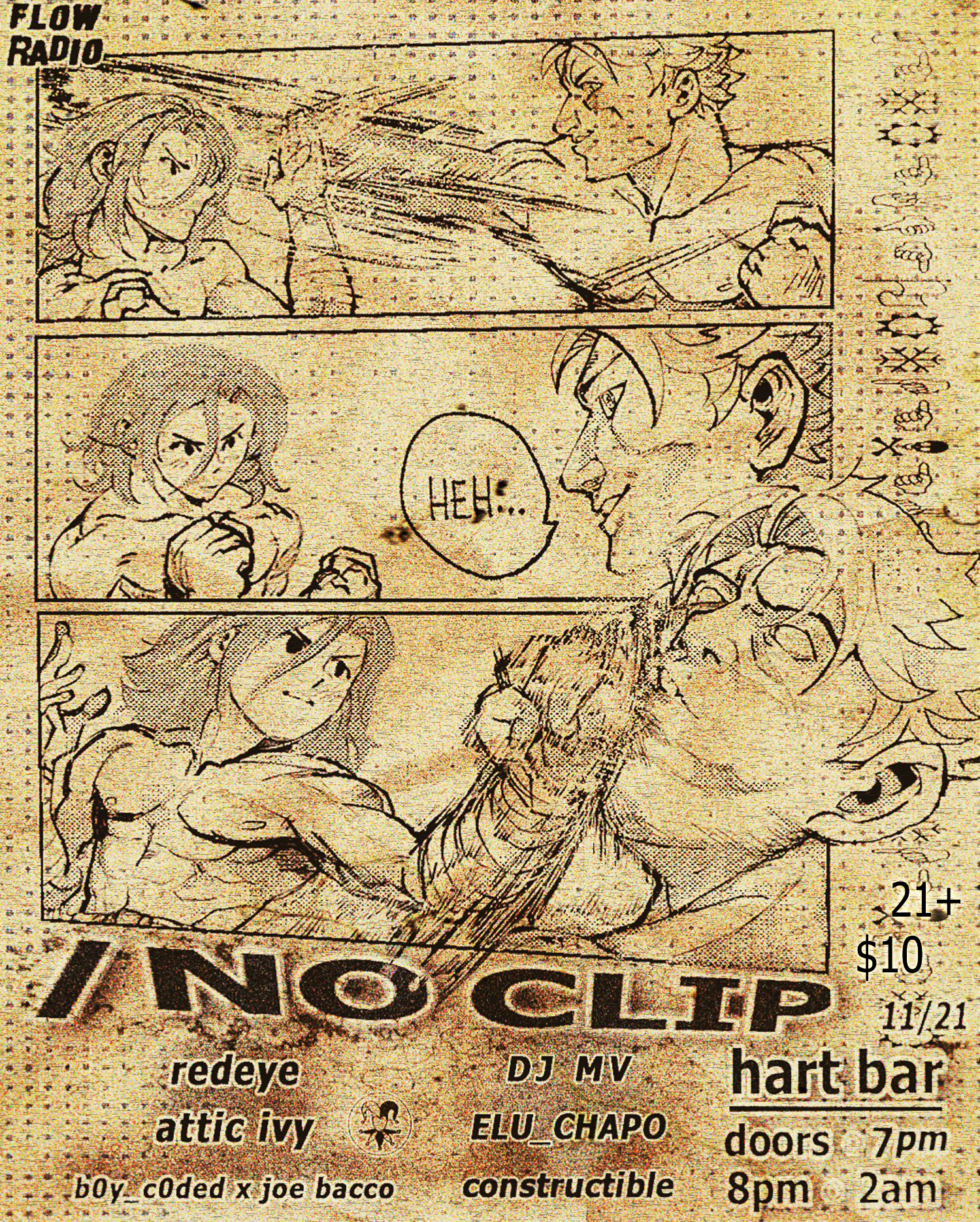 Party series /NOCLIP returns on Thursday, November 21st with a six act lineup featuring two bands and four DJs! This is Flow Radio’s latest celebration following the collective’s move from the Bronx to Brooklyn. Doors open at 7:30 PM. Bands Redeye and Attic Ivy will start the night off at 8:00pm with 45 minute sets. DJs boy_c0ded, Joe Bacco, Constructible, Elu Chapo, and MV will follow up with hour long sets that run until 2:00am.